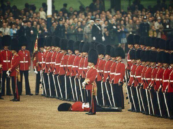 Un guardia irlandés se desmaya durante una ceremonia, pero los otros guardias mantuvieron su atención, Londres 1966